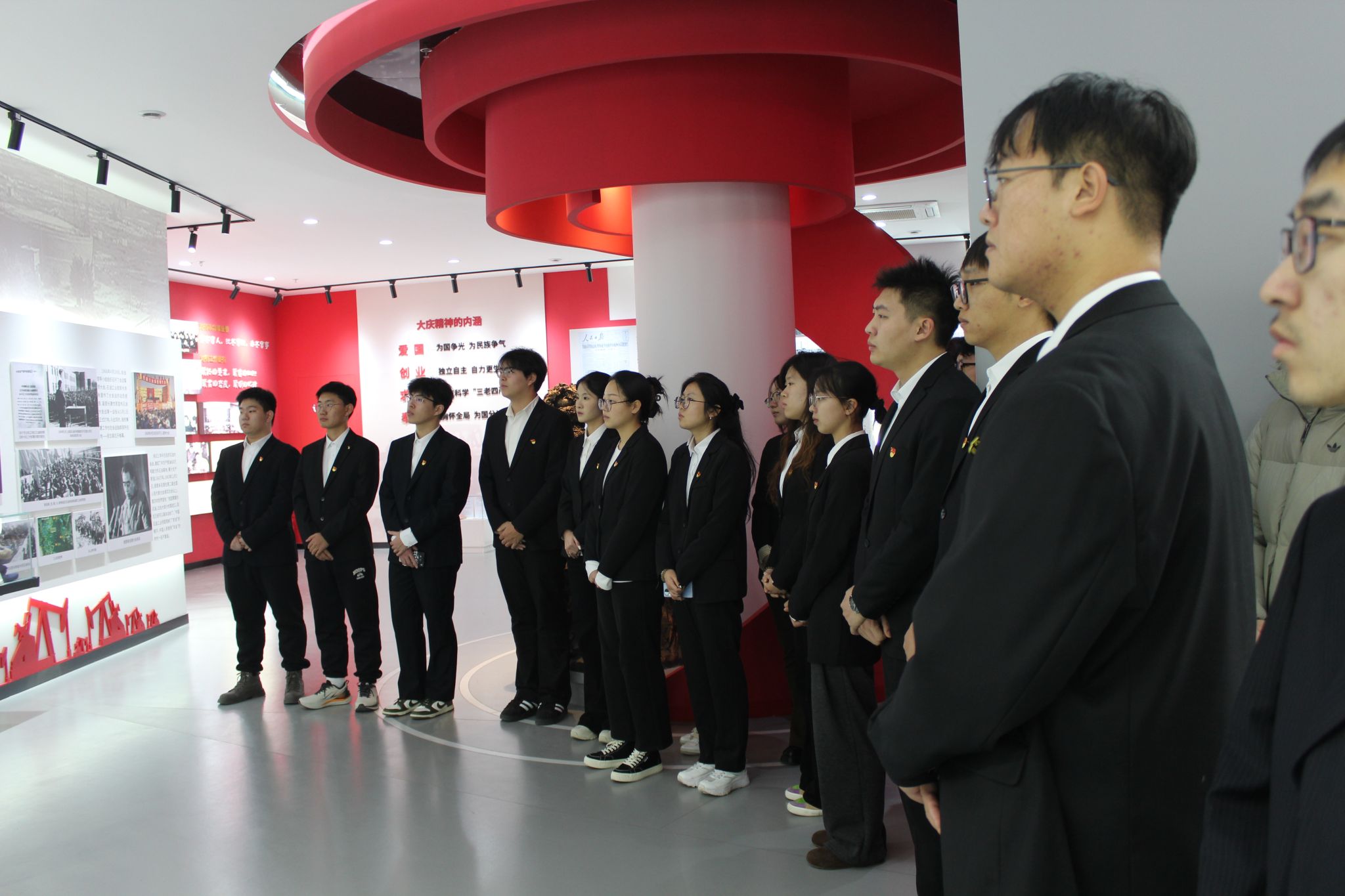在大庆精神育人展馆内,讲解员全程细致讲解,通过珍贵的史料、生动的场景再现,全方位展现了铁人王进喜同志的奋斗历程,深入解读了铁人精神的形成背景、丰富内涵与时代价值。副校长李伟和党员们认真聆听、驻足凝视,在沉浸式研学中深刻感悟铁人精神的磅礴力量,进一步深化了对红色精神的认知与理解。