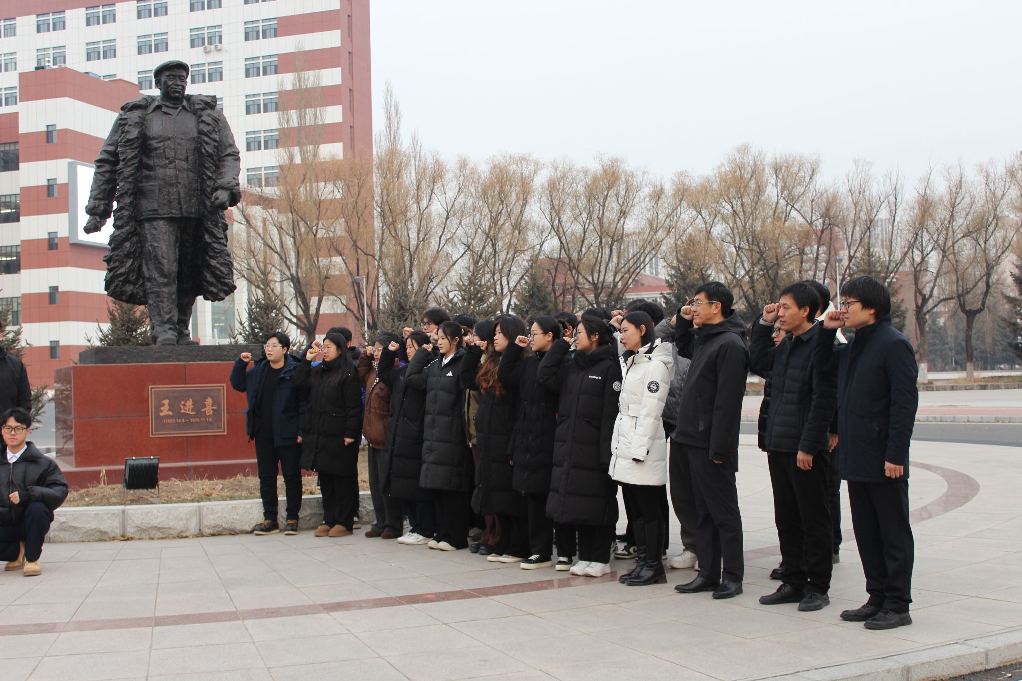 活动伊始,全体党员在大庆精神育人展馆广场的“铁人雕像”前整齐列队。卢梦媚介绍了活动初衷,强调要以铁人精神为指引,让主题党日成为锤炼党性、凝聚共识的重要契机。在领誓人的带领下,副校长李伟与支部党员重温入党誓词。铮铮誓言回荡在广场之上,既表达了对党的忠诚与热爱,更将“爱国、创业、求实、奉献”的大庆精神融入初心使命,进一步坚定了理想信念。