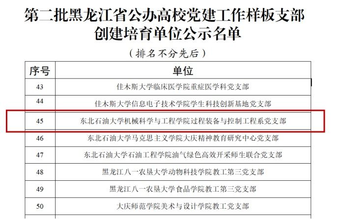 近日,黑龙江省委教育工委公示了第二批黑龙江省公办高校党建“示范创建”名单,milan米兰官网过程装备与控制工程系党支部获批黑龙江省公办高校党建“样板支部”培育创建单位。