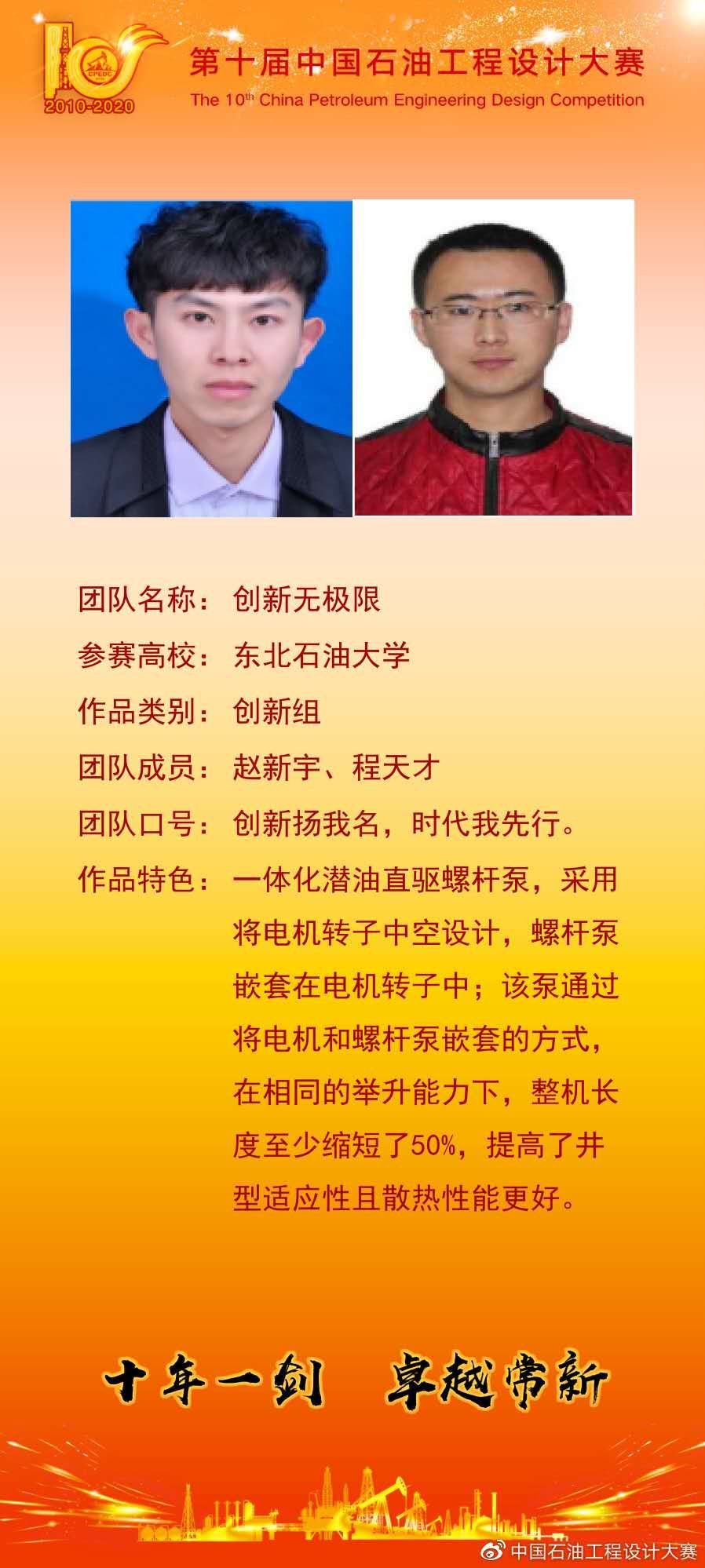 2020年6月13-14日,第十届中国石油工程设计大赛决赛在线上平台顺利举行。共有来自国内27所高校、国外5所高校的5000余名学生和700余名指导教师参与,提交有效作品979份,74支队伍入围全国总决赛。来自中国石油天然气集团公司、中国石油化工集团公司、中国海洋石油集团有限公司和斯伦贝谢公司的61名专家组成专家组,对入围全国总决赛的作品进行评审,评选出一等奖21项,二等奖49项,三等奖4项,milan米兰官网共获方案设计组二等奖6项。其中由milan米兰官网赵新宇和程天才等研究生所完成的“机泵同体潜油直驱螺杆泵”、王中杨和胡金兆等研究生完成的“一体智能高效化精细分注装置”项目获得方案设计类二等奖,董康兴、王宝金两位老师获得优秀指导教师奖。