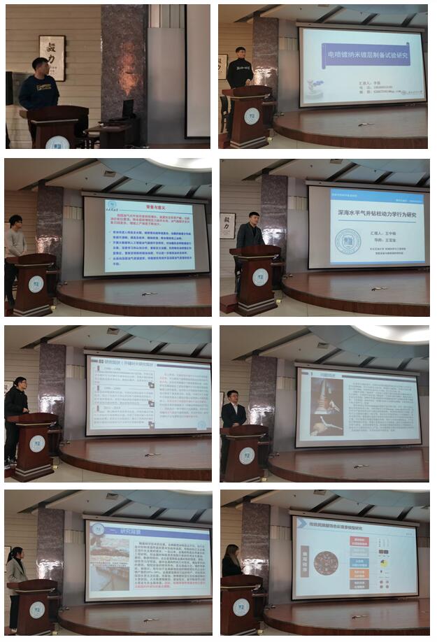 博士研究生刘伟以“浅谈水平井体积压裂套管失效机制研究”为题,阐述了体积压裂技术应用的工程背景,介绍了目前对传统套管失效形式的研究现状。博士研究生李强以“电喷镀纳米镀层制备试验研究”为题,展示了电喷镀技术制备纳米镀层的试验方法,以及纳米镀层性能检测方法。博士研究生李金波以“水力压裂技术对油气田增产改造试验研究”为题,介绍了水力压裂增产改造研究情况,并对深层油气资源压裂开采做了展望。硕士研究生王中杨以“深海水平气井钻柱动力学行为研究”为题,介绍了国内外管道流固耦合相关研究,并通过数值模拟技术分析了环空内气、液两种流体对深海水平钻柱动力学的影响。硕士研究生马擎洋以“电潜泵与CFD仿真研究”为题,展示了电潜泵采油与CFD仿真技术,及其在高含水油井采出液举升中的应用。硕士研究生郭晨浩以“多工况下液压动密封磨损机理研究与仿真分析”为题,介绍了O型密封和VL密封多工况下磨损仿真模型的建立、密封件的摩擦磨损特性分析,并分享了大应变分析的经验。硕士研究生赵丹琼以“超声-喷射电沉积Ni-Co-SiC纳米镀层制备及性能研究”为题,介绍了金属基纳米复合镀层的优良性能及其在工业中的应用情况,总结了不同超声波功率对纳米镀层综合性能的影响及规律。硕士研究生孟祥波以“传统民族服饰色彩意象模型研究”为题,并通过具体设计案例,讲述了如何将人们预期的情感意象转化为具体的设计要素从而进行产品设计。