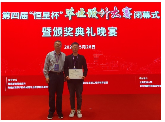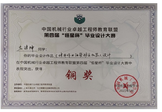2021年5月25~26日,由教育部高等教育司与教育部高等学校机械类专业教学指导委员会指导,中国机械行业卓越工程师教育联盟主办、上海交通大学和北京精雕科技集团有限公司承办的中国机械行业卓越工程师教育联盟第四届“恒星杯”毕业设计大赛,在上海交通大学成功举办。milan米兰官网milan米兰官网的贾光政教授指导、左建坤同学完成的《修井作业油管移运机器人设计》喜获大赛个人项目铜奖。