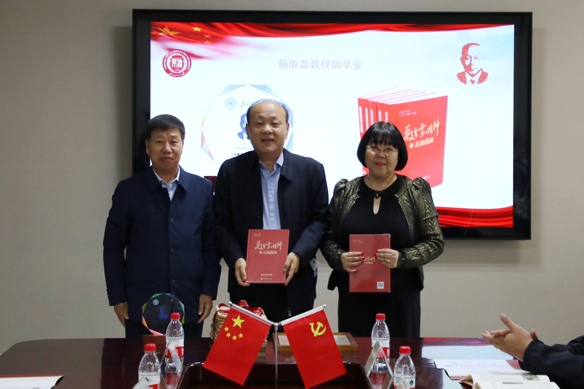 高洪峰代表学校向杨庆、杨松燕赠送《教育家精神与石油报国》丛书。