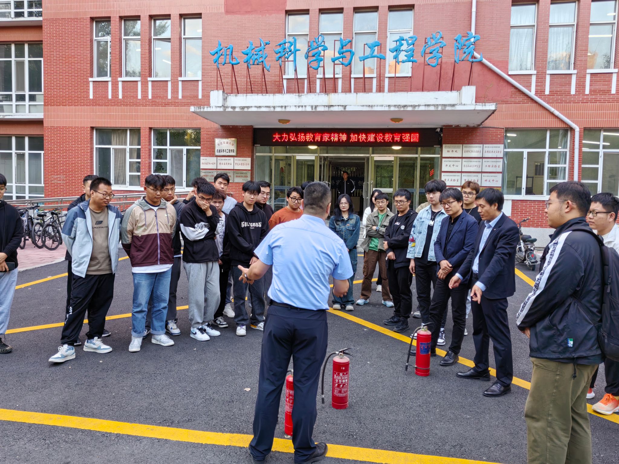 为切实提高学院师生安全意识和火灾自防自救能力,坚决防范和遏制火灾事故发生,9月27日,milan米兰官网联合中消消防知识宣传中心开展安全知识培训及消防疏散灭火演练活动。活动由学院办公室主任石磊组织,学院领导班子、教职工和研究生参加了本次培训。
