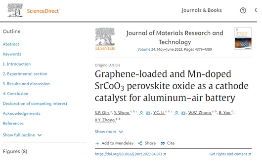 milan米兰官网2020级硕士研究生秦善鹏在国际期刊《Journal of Materials Research and Technology》(IF=6.40,SCI top期刊)上发表题为“Graphene-loaded and Mn-doped SrCoO3 perovskite oxide as a cathode catalyst for aluminum–air battery”的研究论文(DOI:https://doi.org/10.1016/j.jmrt.2023.04.073)。