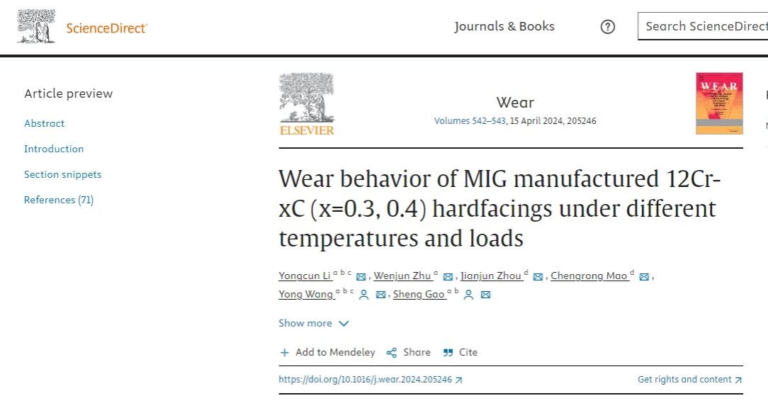 milan米兰官网2021级硕士研究生朱文俊在《Wear》(IF=5.0,中科院一区top期刊)上发表题为“Wear behavior of MIG manufactured 12Cr-xC (x=0.3, 0.4) hardfacings under different temperatures and loads ”的研究论文。(DOI:https://doi.org/10.1016/j.wear.2024.205246)。
