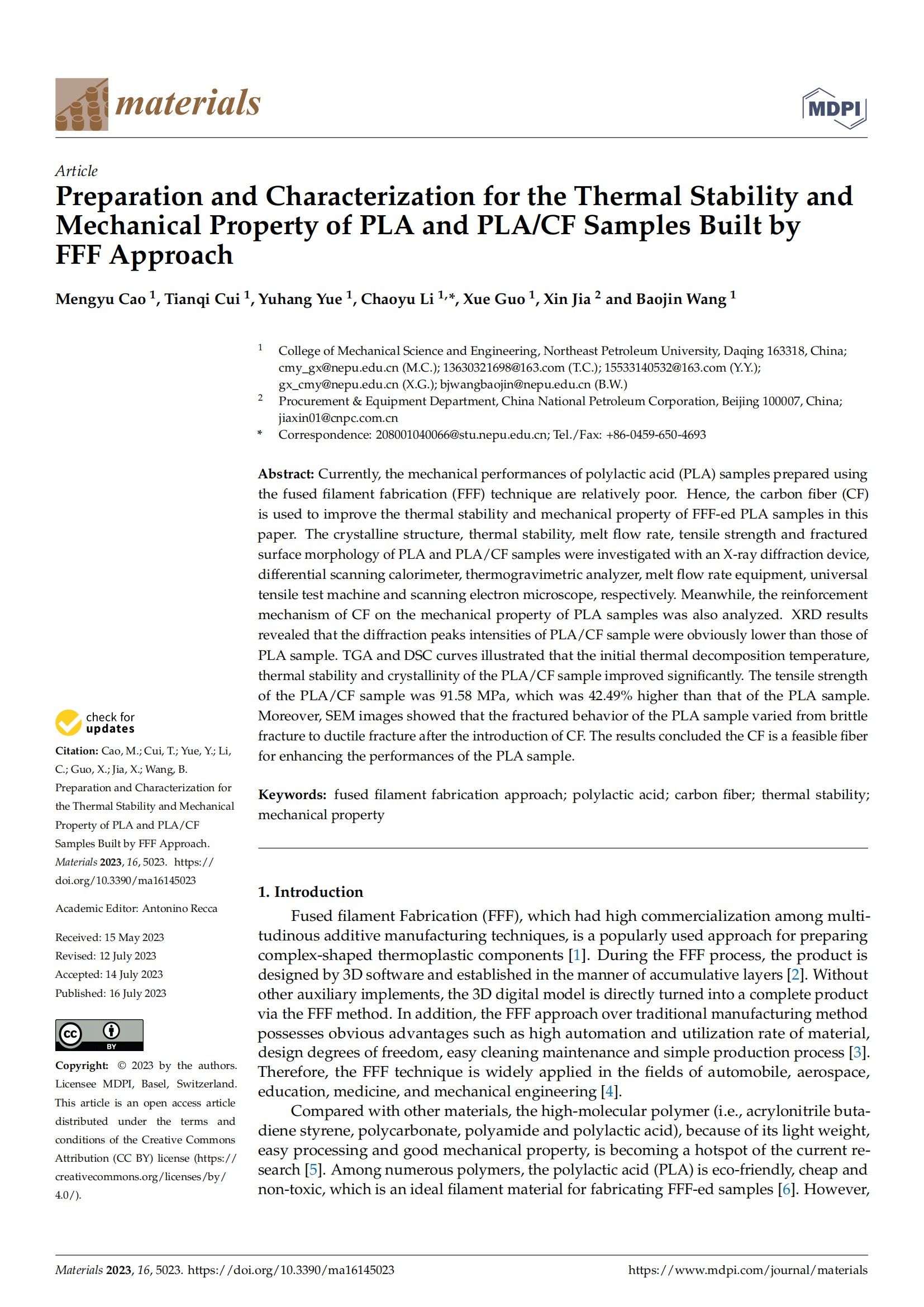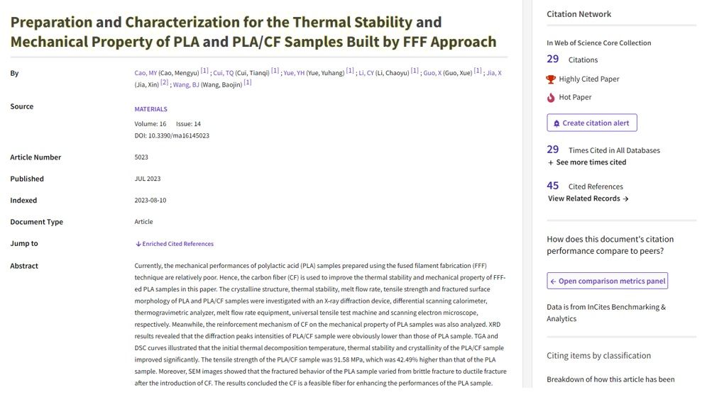 据ESI(Essential Science Indicators, 基本科学指标)数据库2024年3月的数据显示,milan米兰官网机电工程系青年教师曹梦雨为第一作者发表的学术论文“Preparation and Characterization for the Thermal Stability and Mechanical Property of PLA and PLA/CF Samples Built by FFF Approach”(DOI:doi.org/10.3390/ma16145023)同时新增入选为ESI高被引论文(ESI-Highly Cited Papers)与ESI高热点论文(ESI-Hot Papers)。该论文由milan米兰官网青年教师国雪、王宝金及研究生崔天奇、岳宇航、李超宇及中国石油天然气集团有限公司工程师贾鑫共同完成。